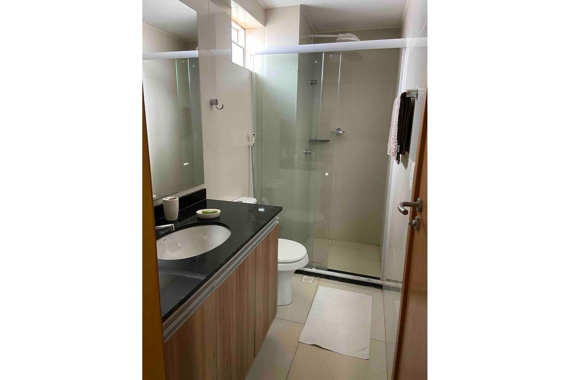 Banheiro: Secador de cabelo, chuveiro elétrico e box de vidro.