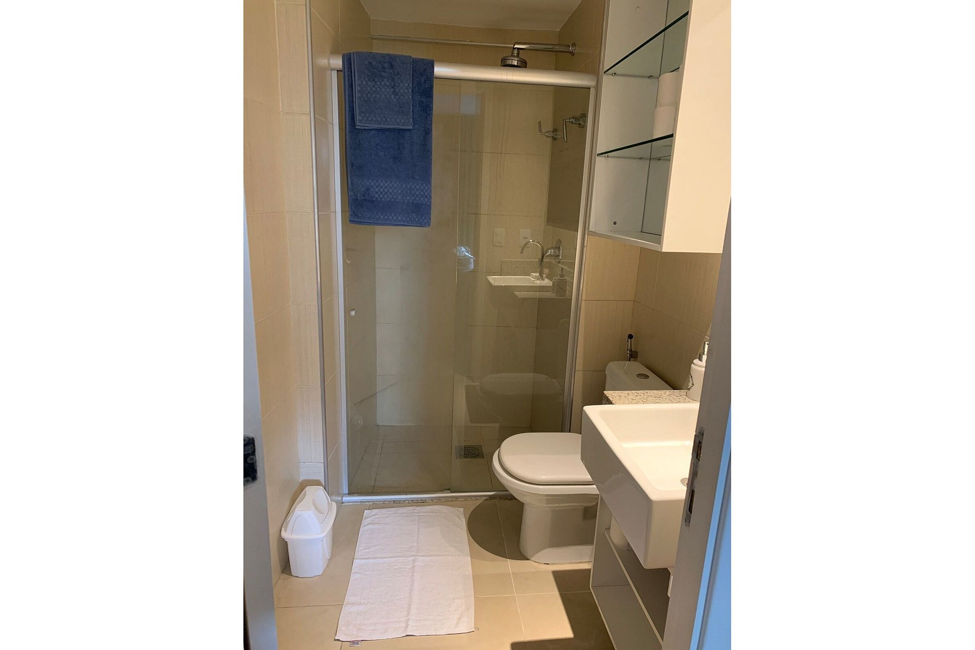 Banheiro: Secador de cabelo, chuveiro elétrico e box de vidro.